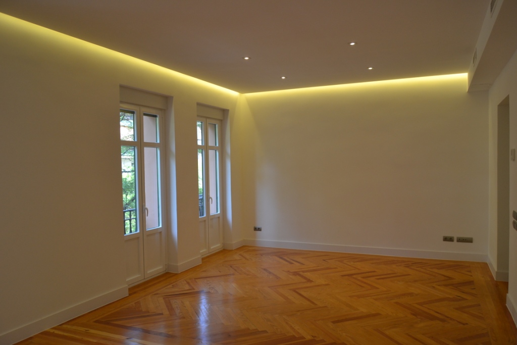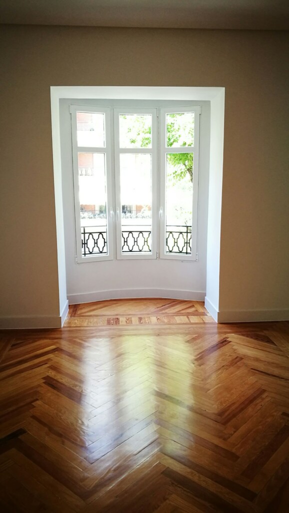 Nuestro objetivo era mantener la esencia clásica del espacio, resaltando molduras, suelos de madera y detalles decorativos que aportan identidad y calidez.